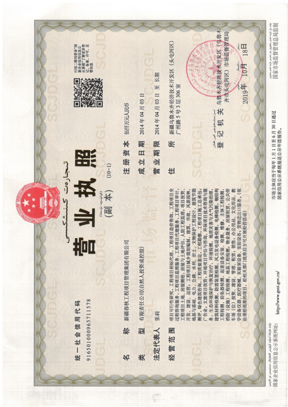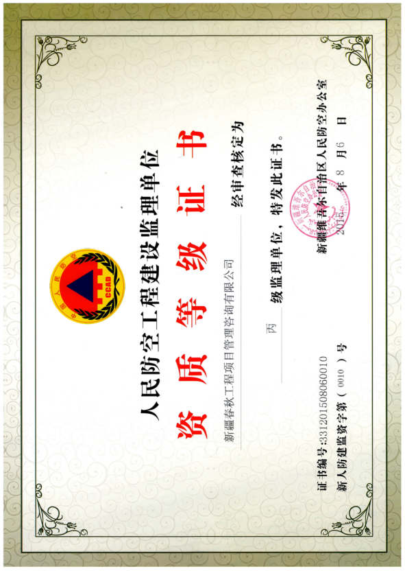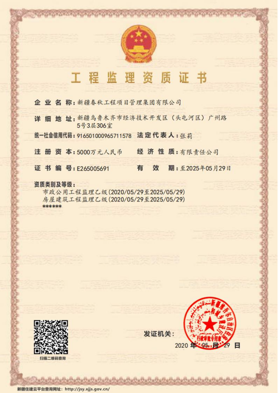 新疆春秋工程项目管理集团有限公司于2005年9月成立,是一家具有多项专业资质的综合型企业,注册资本金5000万元。公司现具有房屋建筑工程监理乙级资质、市政公用工程监理乙级资质、人防工程监理资质、工程造价咨询资质及工程招标代理资质。下辖新疆中科伟业建筑科学设计有限公司、新疆中惠重科机电设备安装有限公司、新疆春秋文化投资有限公司,并在全疆各地(州)及兵团(师、市)设置16家分支机构。主要从事项目可研、环境评价、工程设计、招标代理、工程造价、工程监理、账务审计及工程项目全过程咨询服务等业务。